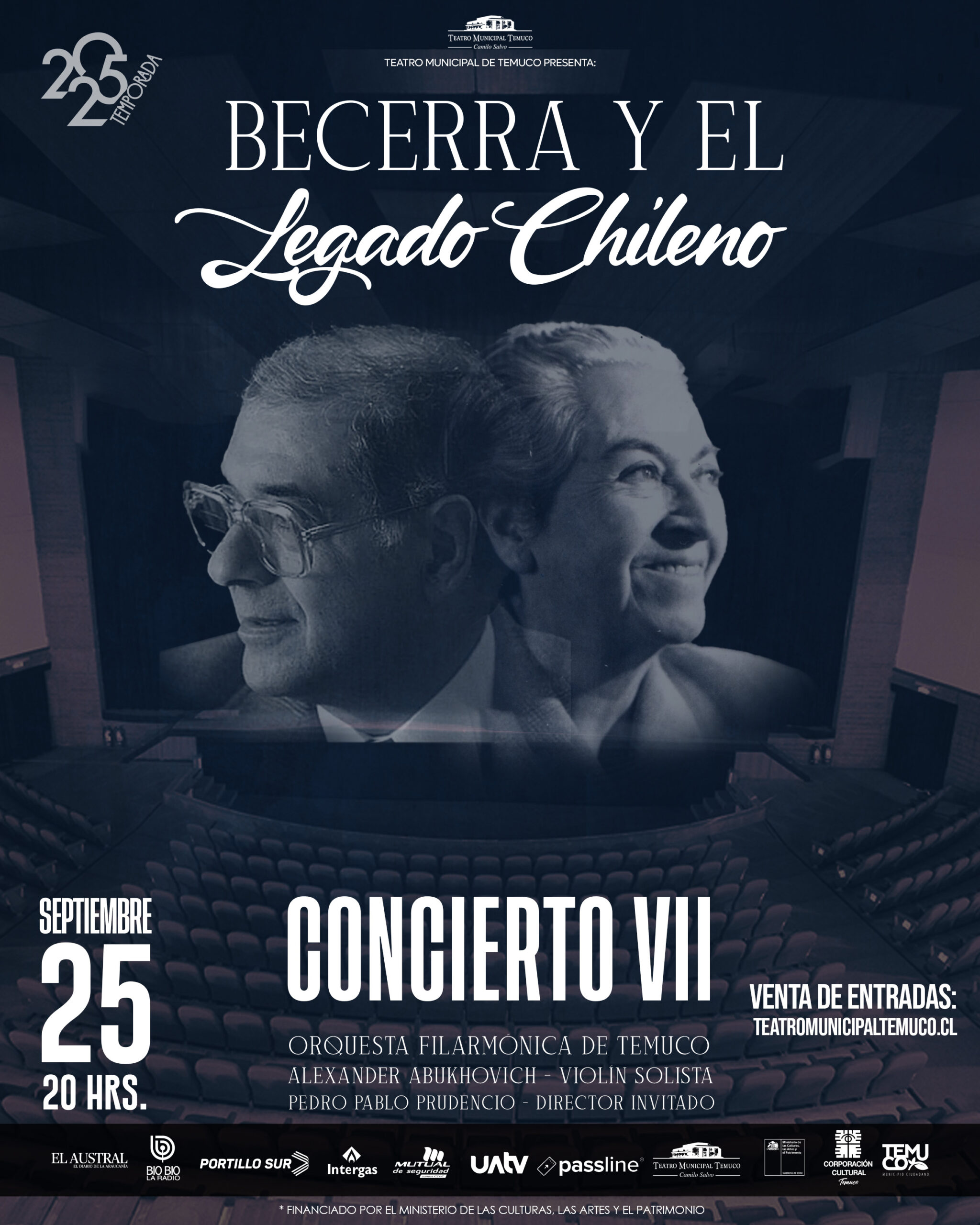 El viernes 26 de septiembre a las 20:00 horas, la Orquesta Filarmónica de Temuco ofrecerá su séptimo concierto de temporada denominado: «Becerra y el legado Chileno» bajo la dirección del maestro invitado Pedro Pablo Prudencio y con la participación del violinista Aleksandr Abukhovich. El programa incluye obras de Alfonso Leng y Claudio Cofré, y culminará con un homenaje a Becerra mediante la interpretación de su Concierto de cámara y el Concierto para violín. Las entradas están disponibles en teatromunicipaltemuco.cl